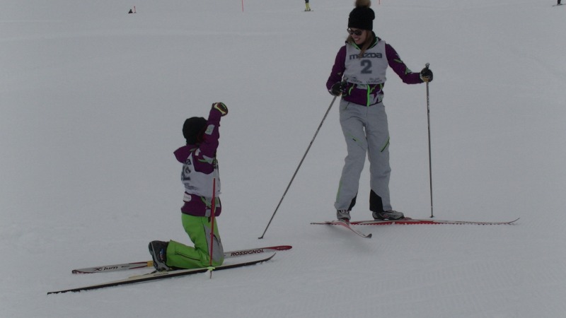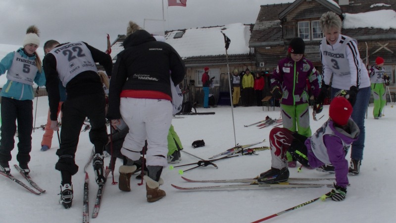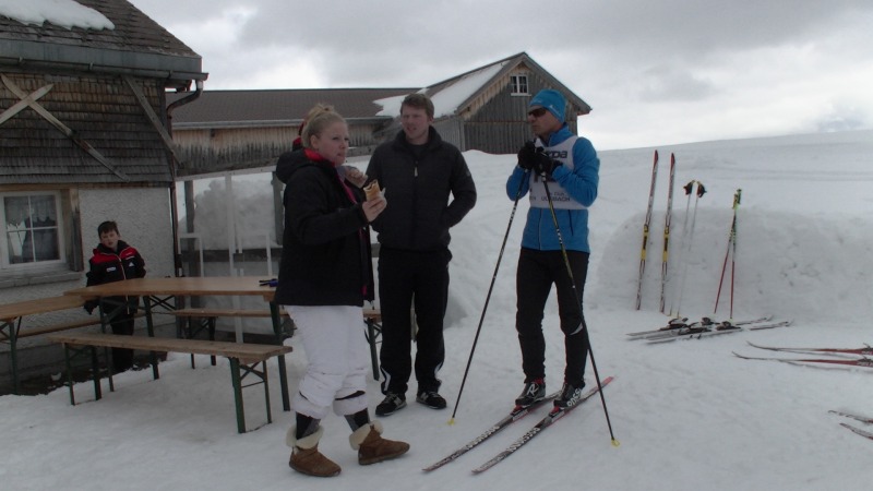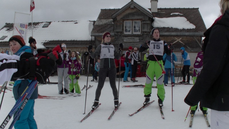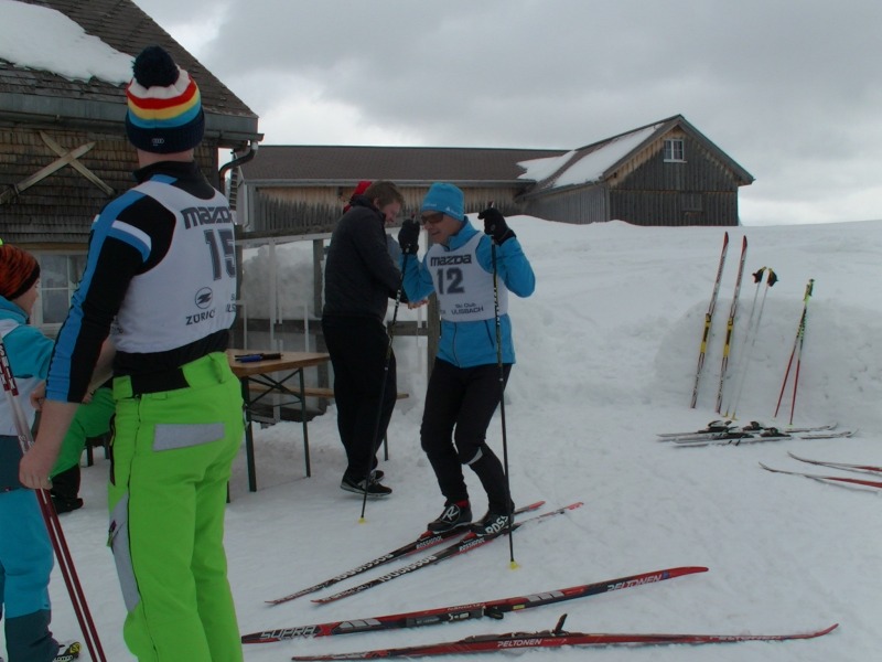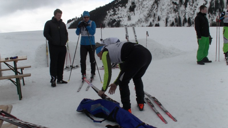 Nach der Stärkung tauschten einige Mitglieder die Skiausrüstung mit der Langlaufausrüstung um den Clubmeister im Langlauf aus zu machen. Nach kurzer Rücksprach mit den Teilnehmern einigte man sich auf 2 Runden für die Männer und eine Runde für die Frauen. Um 13.45 Uhr hatten sich 12 Männer und 5 Frauen für den Langlauf gemeldet. Die Mitglieder stachelten sich gegenseitig an und jeder wollte es auf den schmalen Latten versuchen. Die Zuschauer feuerten die Langläufer heftig an und wurde mit einem Spektakel belohnt. Teils elegant, teils weniger lieferten sich die Teilnehmer einen super Kampf. Es machte richtig Freude zu zuschauen.
