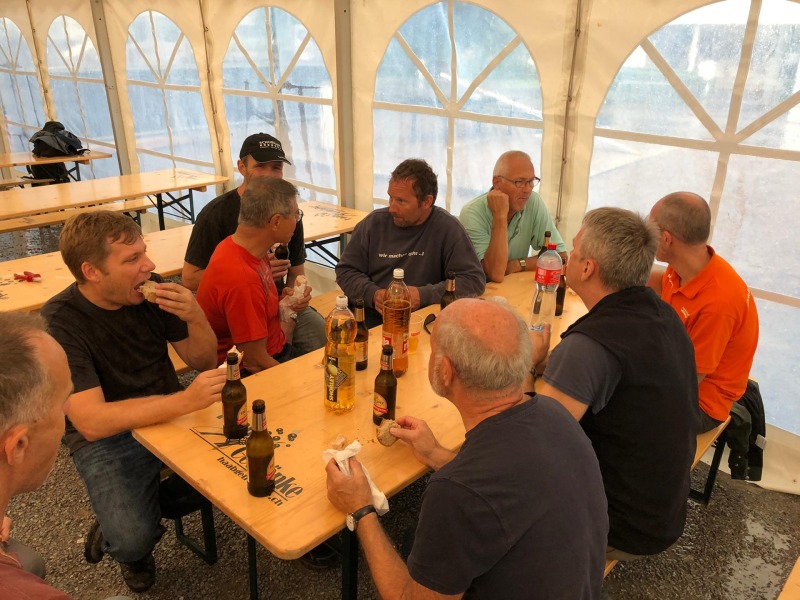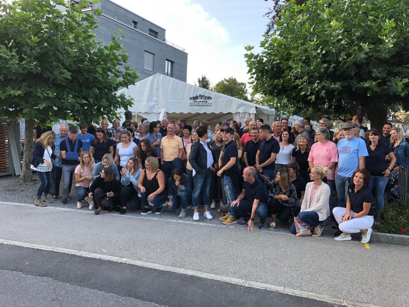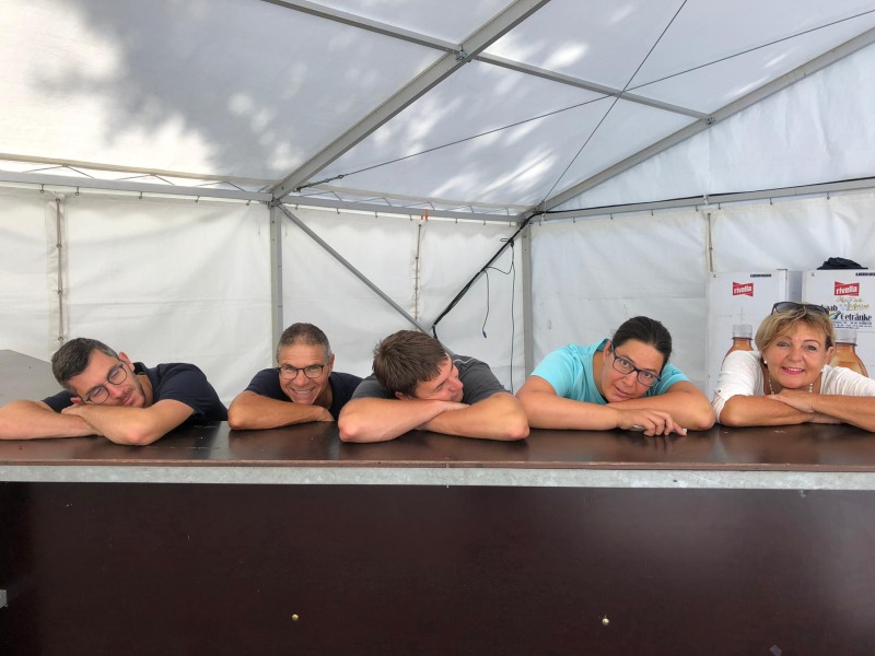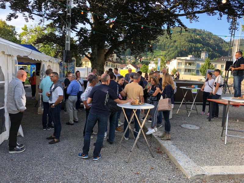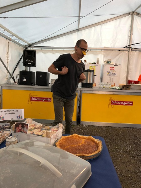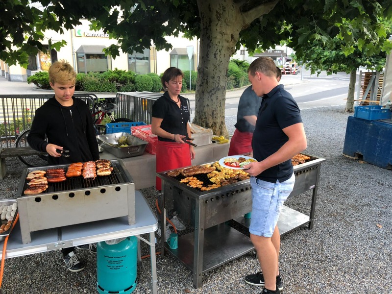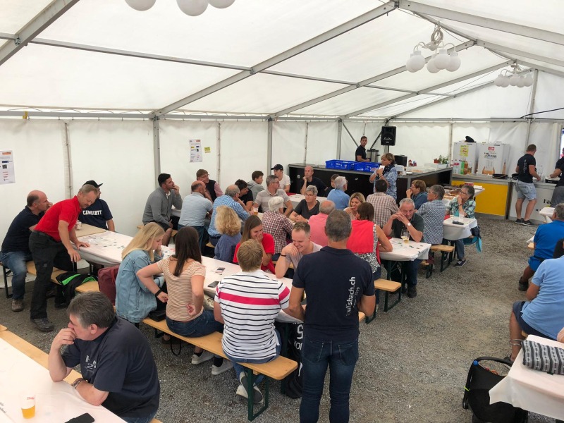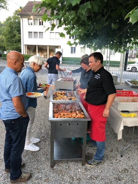 Die Festgesellschaft formierte sich dann kurz für ein Gruppenfoto ehe sich alle in das Festzelt begaben wo Fabian Rütsche seine erste Comediansequenz zum Besten gab. Die Stimmung war bereits ausgelassen und alle konnten so richtig herzhaft über seine Show lachen. Zum Lachen gesellte sich ein leichtes Knurrgeräusch, welches das Zeichen war, dass das Grill- und Salatbuffet eröffnet werden sollte. Daniela und Markus Bösch verwöhnten uns mit Fleisch, Salat und Kartoffelgratin, es war einfach phantastisch.