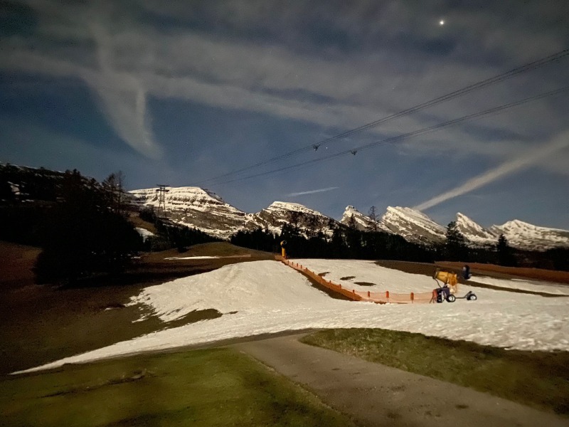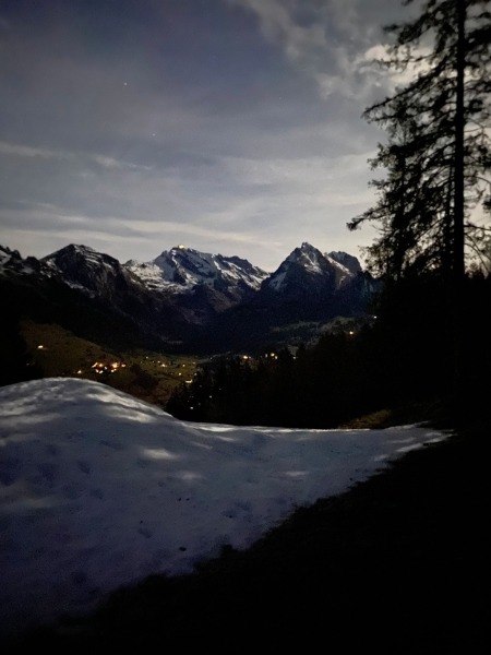 Wenn man das Wetter hätte planen können, hätte man es genau so gemacht.Es war eine klare Nacht und der Vollmond gab seine Stärke zum Besten. Die Bäume warfen Schatten und der Schnee in den Bergspitzen leuchtete förmlich. Eine Lampe brauchte man auch im Wald nicht. Es war eine unbeschreiblich diese Stimmung.